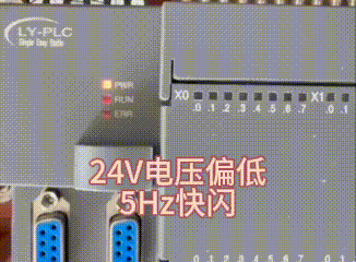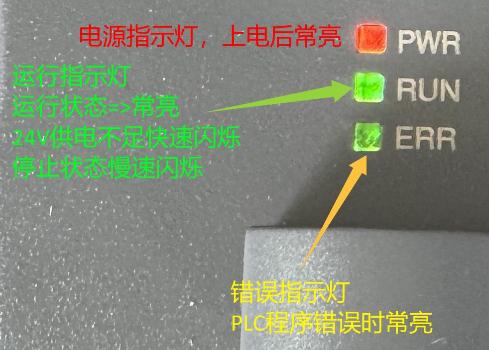 • RUN(运行):运行时常亮;停止时1Hz慢速闪烁;24V电压不足(低于22V)时5Hz快速闪烁;错误时熄灭